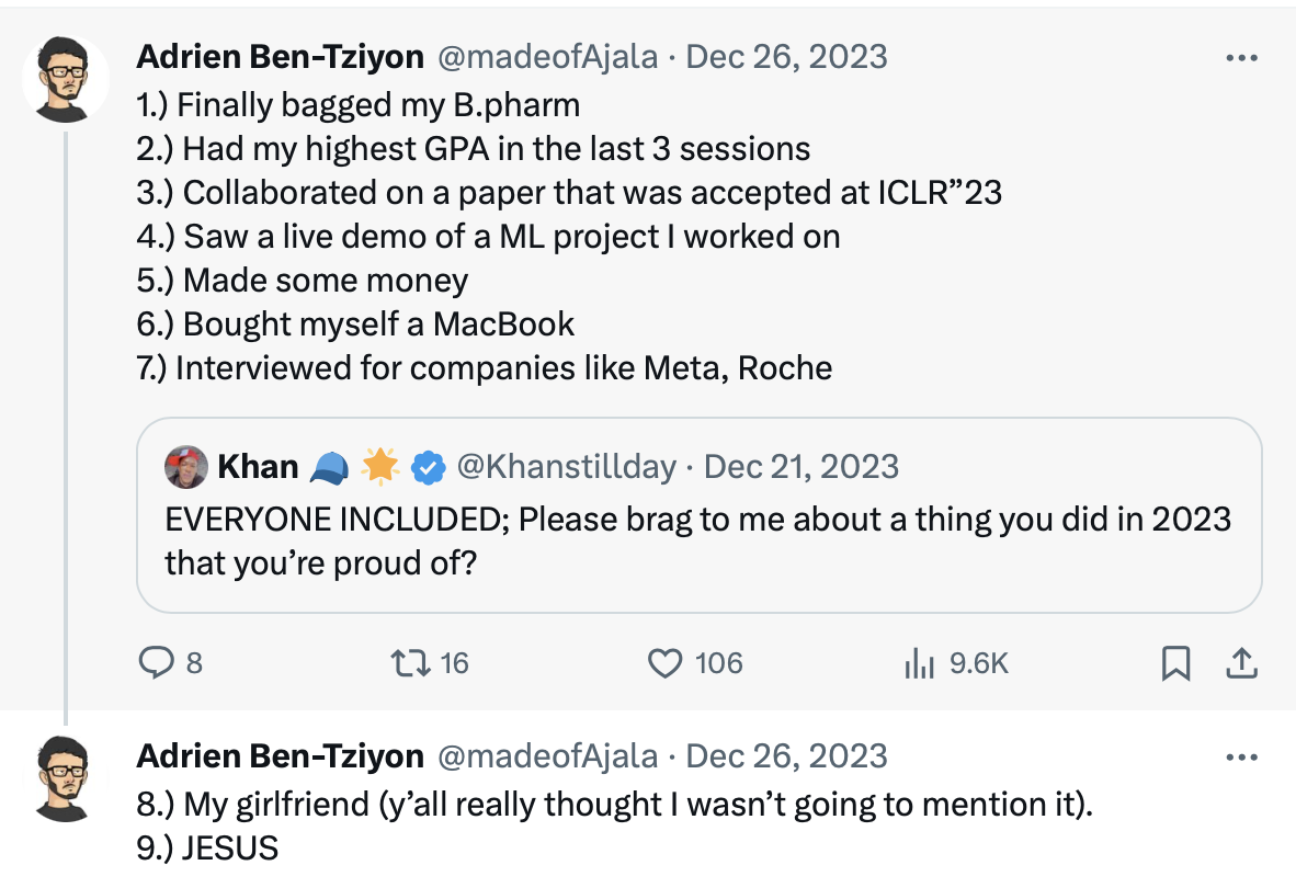 2023 was a solid year for me, but it took me writing out this thread on Twitter sometime last week for me to come to terms with how great it was. Here is the thing, I started this year on a great note and with high expectations. Finally, I was doing my dream job as a machine learning engineer at a new but awesome startup building a very nice product. The best part of it? My role was core machine learning, machine learning engineering and ops, just enough dose of what I like and enjoy doing, life was good bruh!! I think the peak was me attending Lagos Tech Expo and seeing the excitement and awe on people’s faces using the product I’ve been building, it’s like that moment when a mother finally meets the baby she has been carrying for months, the joy is incomprehensible.