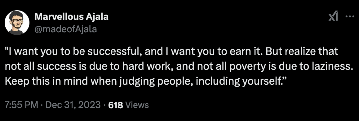 “I want you to be successful, and I want you to earn it. But realize not all success is due to hard work, and not all poverty is due to laziness.”